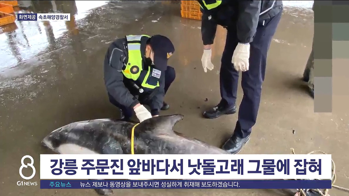 오늘 오전 10시 30분쯤 강릉 주문진 동방 14km 해상에서 낫돌고래 1마리가 그물에 걸려 죽은 채 발견됐습니다.
