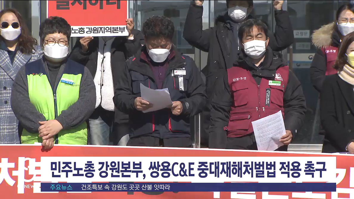 전국민주노동조합총연맹 강원지역본부는 고용노동부 강릉지청 앞에서 기자회견을 열고, 최근 쌍용C&E 동해공장에서 발생한 사망사고와 관련해 중대재해처벌법 적용을 촉구했습니다.