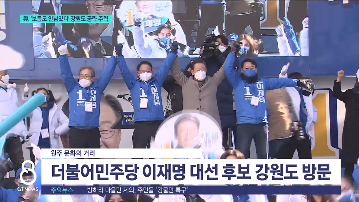 "더불어민주당 이재명 후보는 조만간 춘천과 동해안지역을 다시 찾아 강원도 표심 공략에 나설 것으로 알려졌습니다. G1뉴스 김기태입니다."