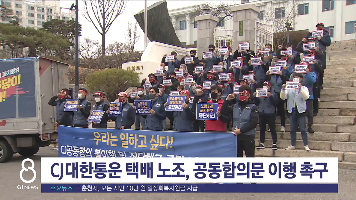 CJ대한통운 택배 노조 강원지부는 오늘(14일) 강원도청 앞에서 기자회견을 열고 공동합의문 이행을 촉구했습니다.