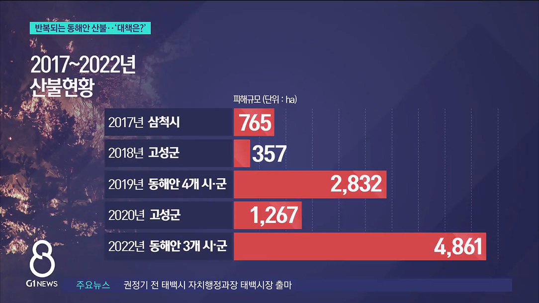 /피해면적이 100ha 이상일 때 대형 산불로 분류되는데, 그동안 강원도의 대형산불은 끊이질 않았습니다./