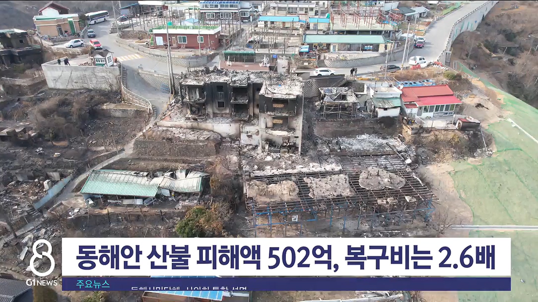 강원도 동해안 산불 피해액이 502억 원이며, 복구비는 피해액의 2.6배에 달하는 1,301억 원이 필요한 것으로 조사됐습니다.