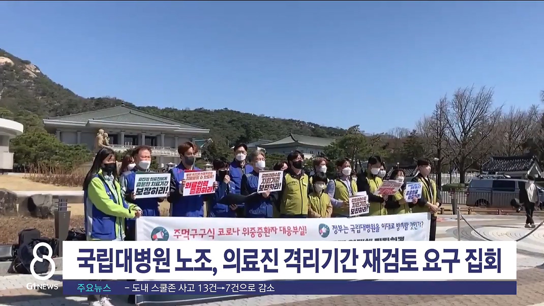 강원대병원 등이 참여한 전국 국립대병원 의료 노조가 오늘(28일) 청와대 앞에서 기자회견을 열고, 의료진 격리기간 단축 지침 전면 재검토를 요구했습니다.