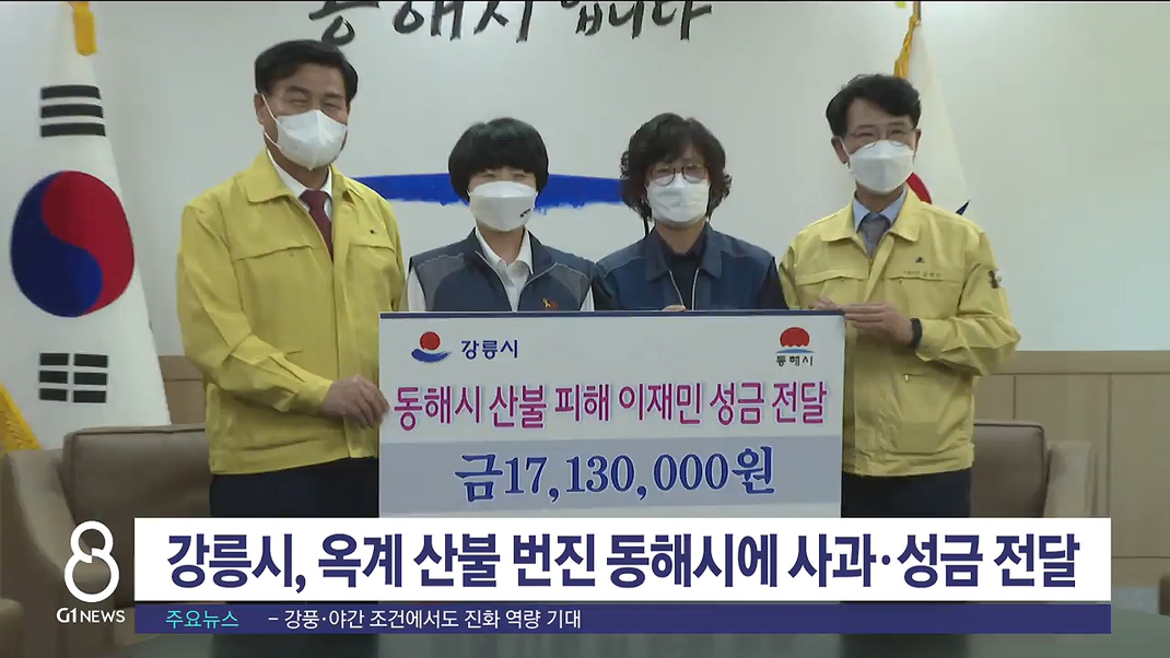 김한근 강릉시장은 "우리 지역에서 발생한 산불이 이웃 동해시까지 번져 많은 피해를 입힌 데 대해 시민 모두 송구하고 안타까운 마음을 갖고 있다"며 직원들이 모금한 성금 1,700만 원을 심규언 동해시장에게 전달했습니다.