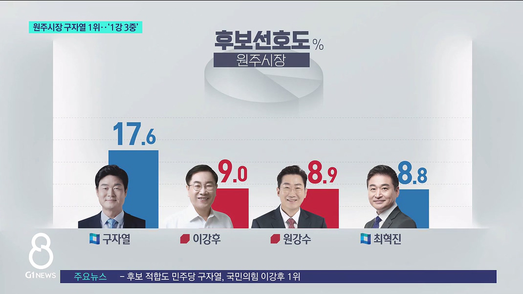 이강후 전 국회의원 9%, 원강수 전 강원도의원 8.9%, 최혁진 전 청와대 경제수석실 비서관이 8.8%로, 구 전 실장이 오차범위 밖에서 앞선 가운데 3명의 후보가 추격하는 양상입니다./