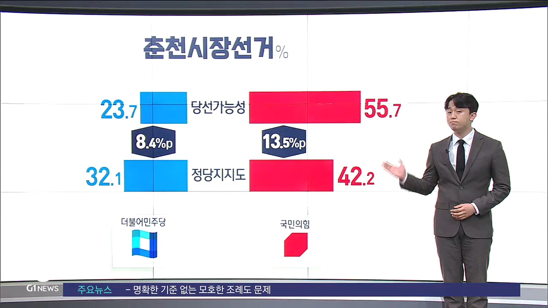 /춘천 응답자의 당선 가능성 후보 평가에서는 국민의힘 55.7%, 더불어민주당 23.7% 였습니다.