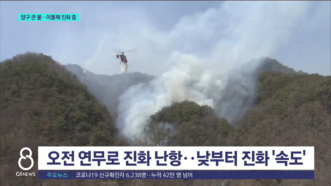 어제 양구에서 난 산불이 이틀째 잡히지 않고 있습니다.