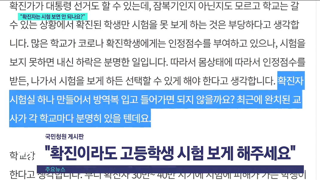 학부모가 쓴 글인데, 코로나19에 확진된 고등학생도 중간고사를 볼 수 있게 해달라는 내용입니다.
