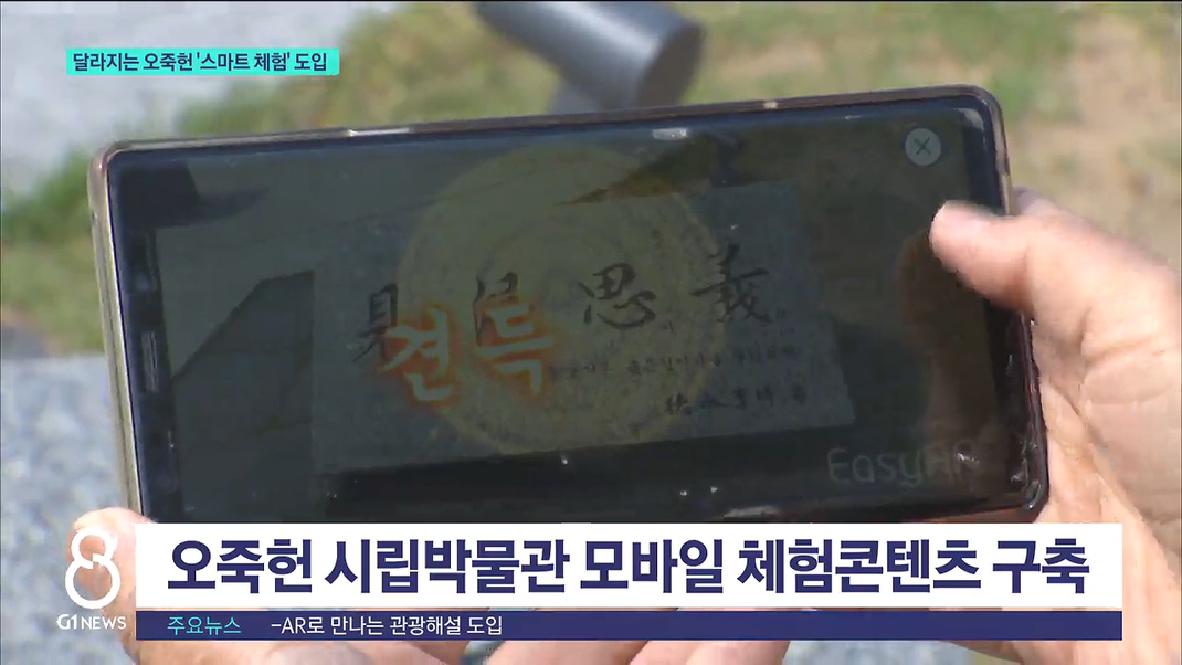스마트폰에 오죽헌 시립박물관 앱을 설치하자, 증강현실 콘텐츠가 화면에 나타납니다.