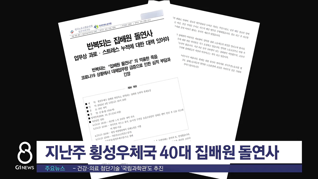 지난 15일 오후 4시 30분쯤, 횡성우체국 집배원 A씨가 급격한 피로감을 호소하며 조퇴한 뒤, 자택에서 숨졌습니다.
