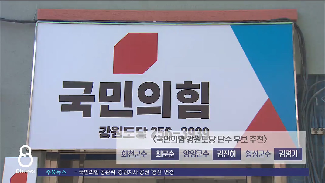 국민의힘 강원도당은 제5차 공관위 회의를 열고 화천군수 최문순, 양양군수 김진하, 횡성군수에 김명기 후보를 단수 후보 추천했습니다.
