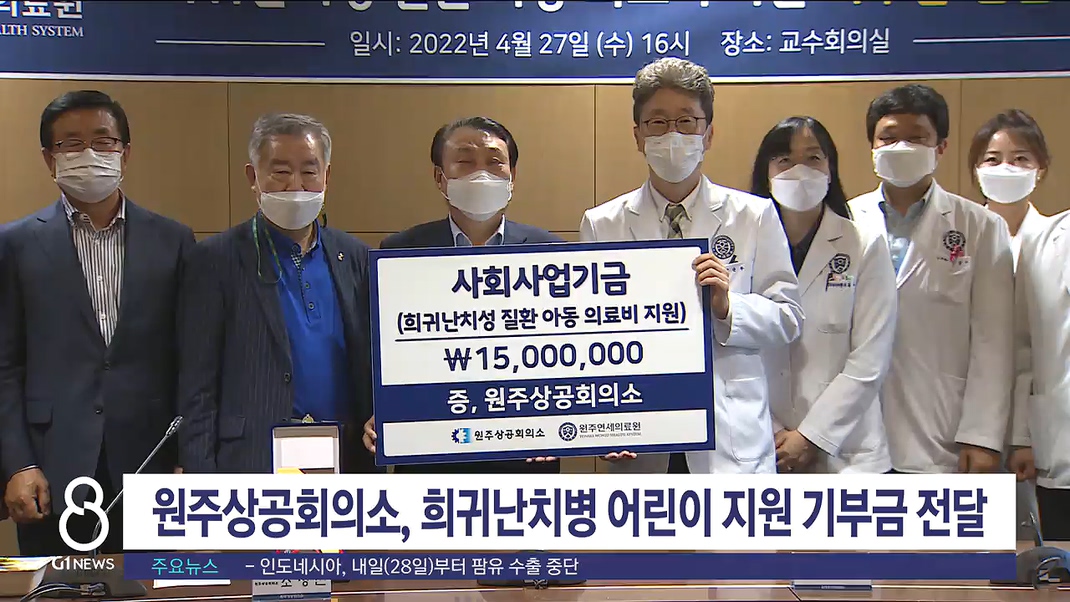 원주상공회의소는 오늘(27일) 원주 세브란스기독병원에서 희귀난치병 어린이 치료를 위해 써 달라며 1,500만 원을 전달했습니다.