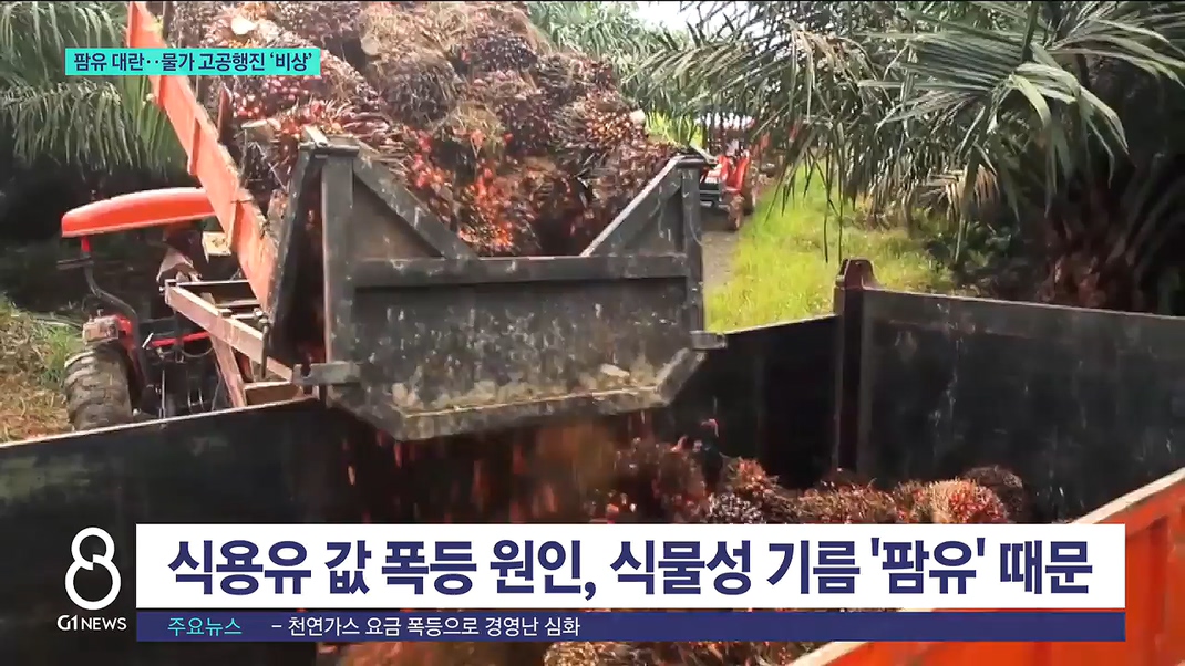 코로나19 이후 회복된 소비에 팜유 수요가 늘어난 데다, 우크라이나 사태로 팜유 가격이 폭등했습니다.