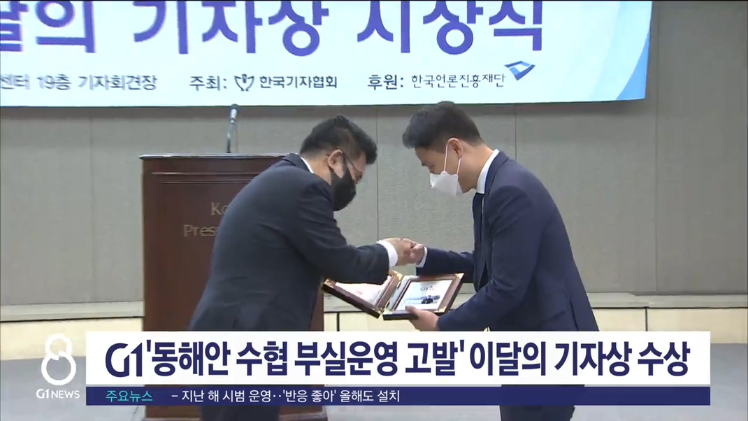 G1방송이 단독 보도한 '동해안 수협 부실운영 실태 고발' 연속 보도가 한국기자협회 제379회 이달의 기자상을 수상했습니다.