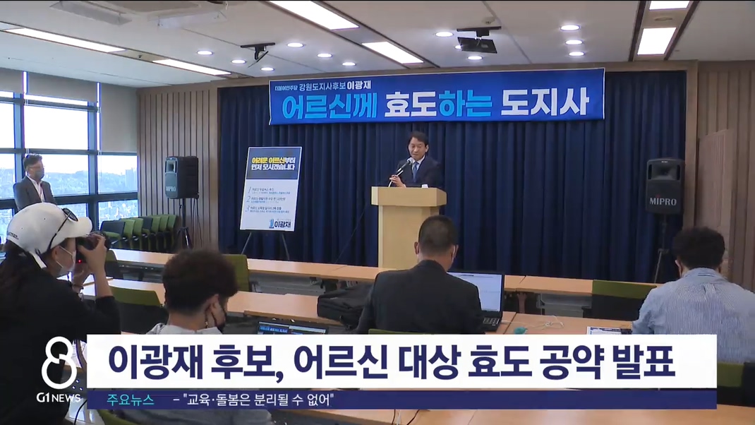 이광재 더불어민주당 강원도지사 후보가 강릉시청에서 노인 관련 공약을 발표했습니다.