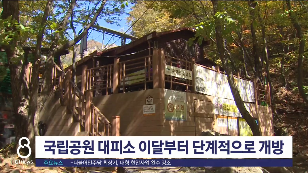 국립공원공단은 오는 16일부터 다음달 말까지 대피소를 시범 개방하고, 7월부터 격리실을 제외한 대피 공간을 개방할 계획이라고 밝혔습니다.