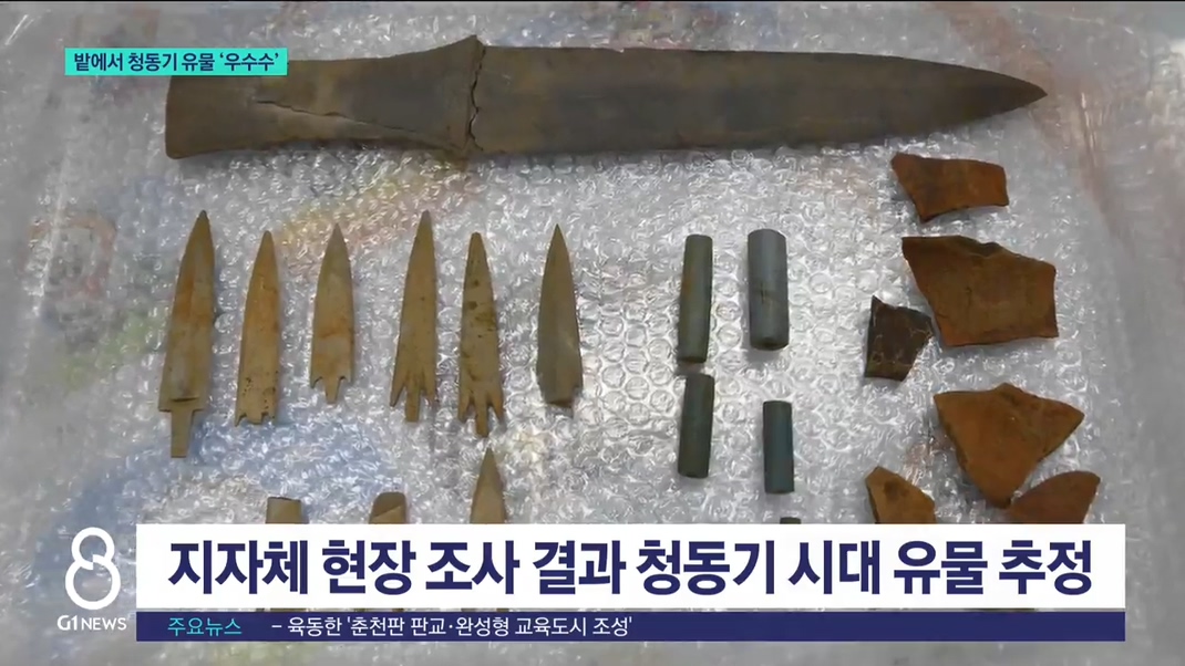 평창에서는 농민이 밭을 갈다 청동기 시대 걸로 추정되는 유물을 잔뜩 발견했습니다.