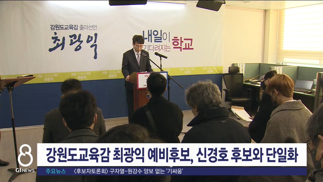 강원도교육감 최광익 예비후보가 신경호 후보 지지선언을 하면서 사실상 두 후보간 단일화가 이뤄졌습니다.