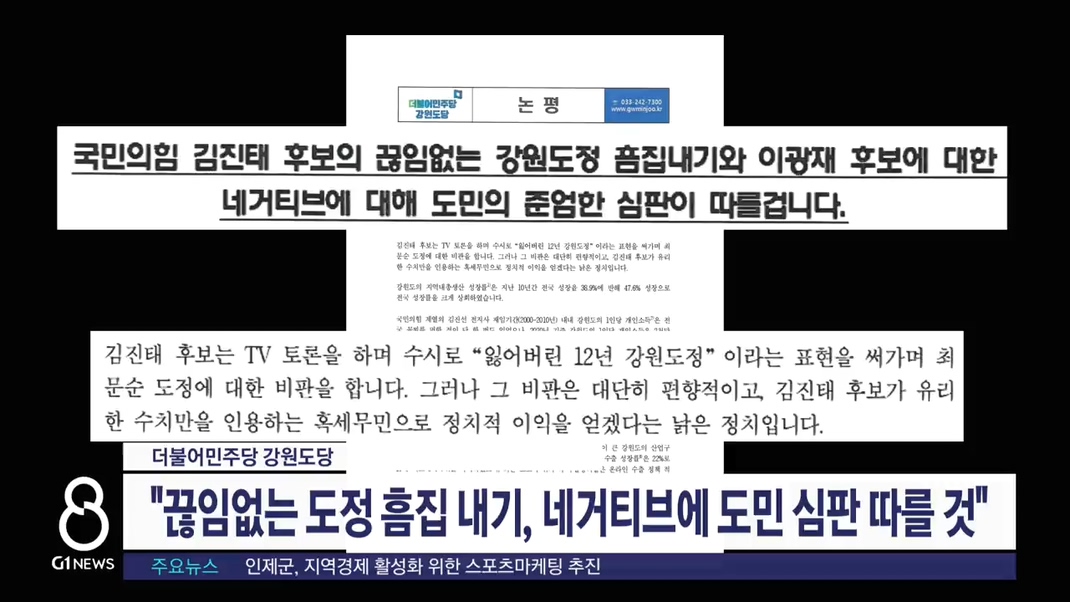"김진태 후보의 끊임없는 강원도정 흠집내기와 이광재 후보에 대한 네거티브에 대해 도민의 준엄한 심판이 따를 것"이라고 반박했습니다.
