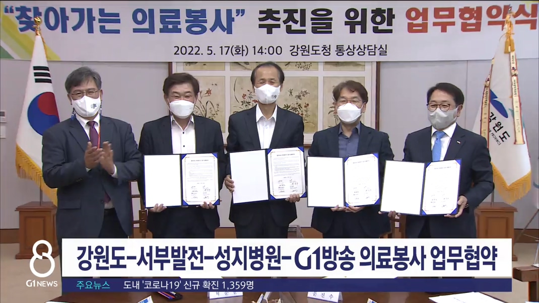 강원도와 한국서부발전, 성지병원, G1방송이 의료 사각지대에 있는 도민들의 삶의 질 향상을 위해 '찾아가는 의료봉사' 업무 협약을 맺었습니다.