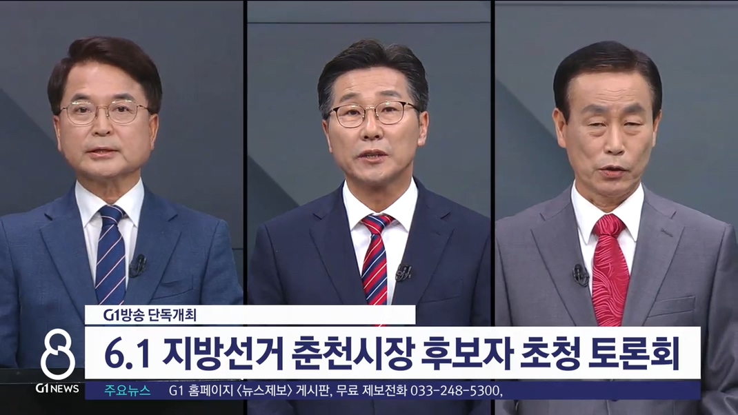 6.1 지방선거를 앞두고 유권자들의 선택을 돕기 위해 마련된 춘천시장 후보자 초청 토론회가 G1방송에서 열렸습니다.