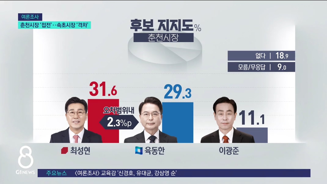 두 지역 모두 국민의힘 후보가 앞서고 있지만, 춘천시장 선거는 오차범위 내 접전을,