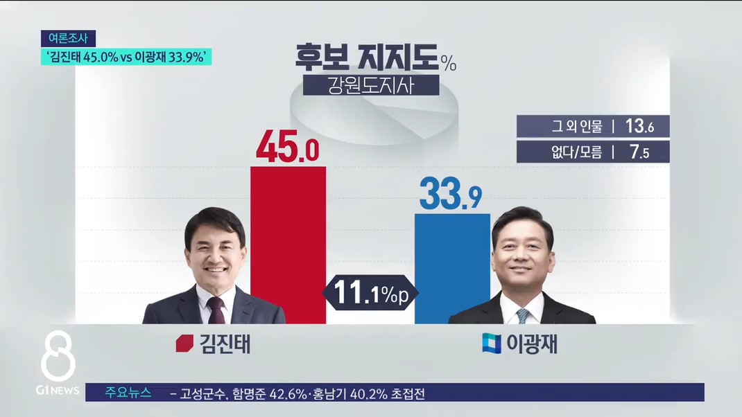 국민의힘 김진태 후보 45.0%, 더불어민주당 이광재 후보 33.9%를 기록했습니다.
