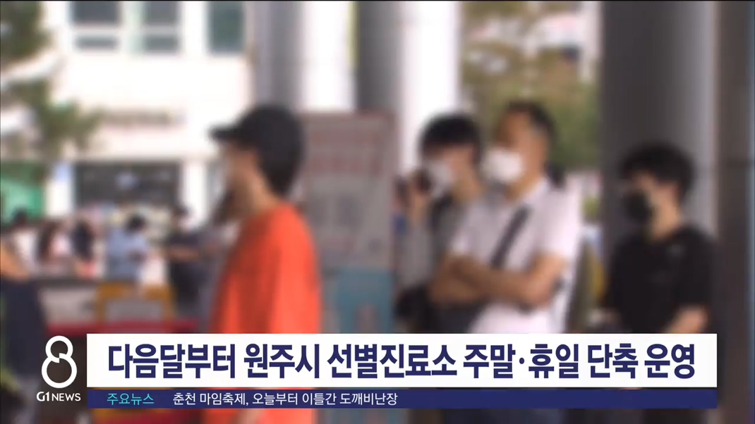 원주시는 다음달 1일부터 주말과 휴일 보건소 선별진료소 운영 시간을 오전 9시부터 12시까지 3시간만 운영한다고 밝혔습니다.