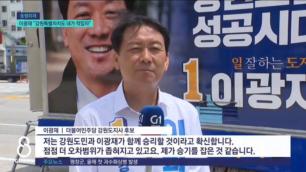 "저는 강원도민과 이광재가 함께 승리할 것이라고 확신합니다. 점점 더 오차범위가 좁혀지고 있고요. 제가 승기를 잡은 것 같습니다."