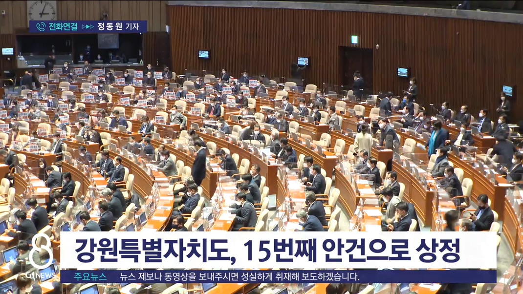 현재 강원특별자치도 설치를 위한 특별법안이 국회 본회의 15번째 처리 안건으로 상정돼 입법화를 목전에 두고 있습니다.