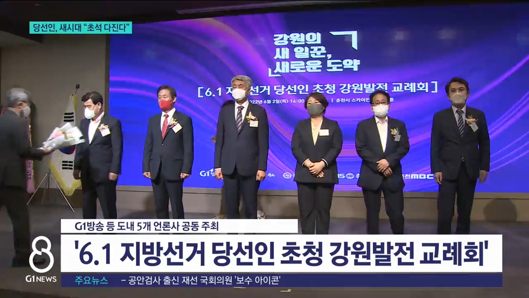 G1방송 등 도내 5개 언론사가 공동 주최한 '6.1 지방선거 당선인 초청 강원발전 교례회'가 춘천에서 열렸습니다.