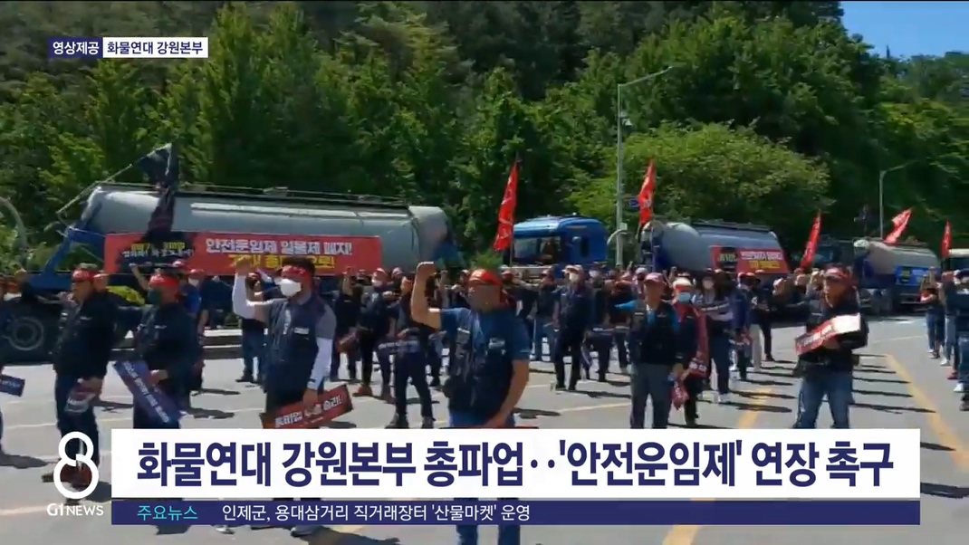 화물연대 강원본부는 경유값 폭등으로 화물노동자의 생계가 위협받고 있다며, 한시적으로 적용되는 안전운임제를 연장하고 적용 대상을 모든 화물차로 확대할 것을 요구했습니다.