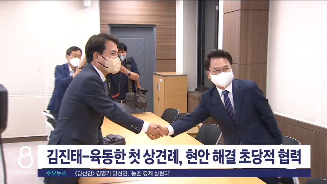 국민의힘 김진태 강원도지사 당선인과 더불어민주당 육동한 춘천시장 당선인이 지방선거 후 첫 상견례를 갖고, 현안에 대한 긴밀한 협력을 약속했습니다.