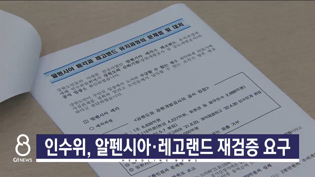 강원도지사직 인수위원회가 알펜시아 매각과 레고랜드 유치 과정에 문제를 제기했습니다. 도지사 당선인에게 사실관계 규명과 적절한 조치를 요구해 논란이 예상됩니다.
