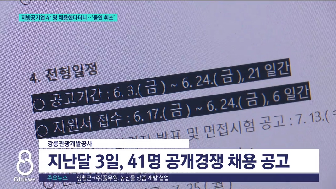 채용이 왜 취소됐느냐는 취재에 대해서도 강릉관광개발공사 측은 "기관 내부 사정으로 일정이 변경된 것이며, 지원자들에게는 모두 일대일로 취소를 설명했다"고 밝혔습니다.
