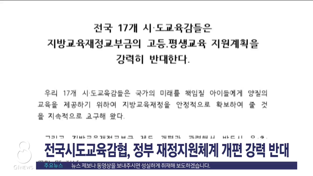정부가 유초중고에 쓰는 지방교육재정교부금을 대학에도 나눠쓰겠다는 재정지원체계 개편 계획을 발표한데 대해, 전국시도교육감협의회는 지난달(6월)에 이어 두 번째로 성명서를 내고 반대 의견을 분명히 했습니다.