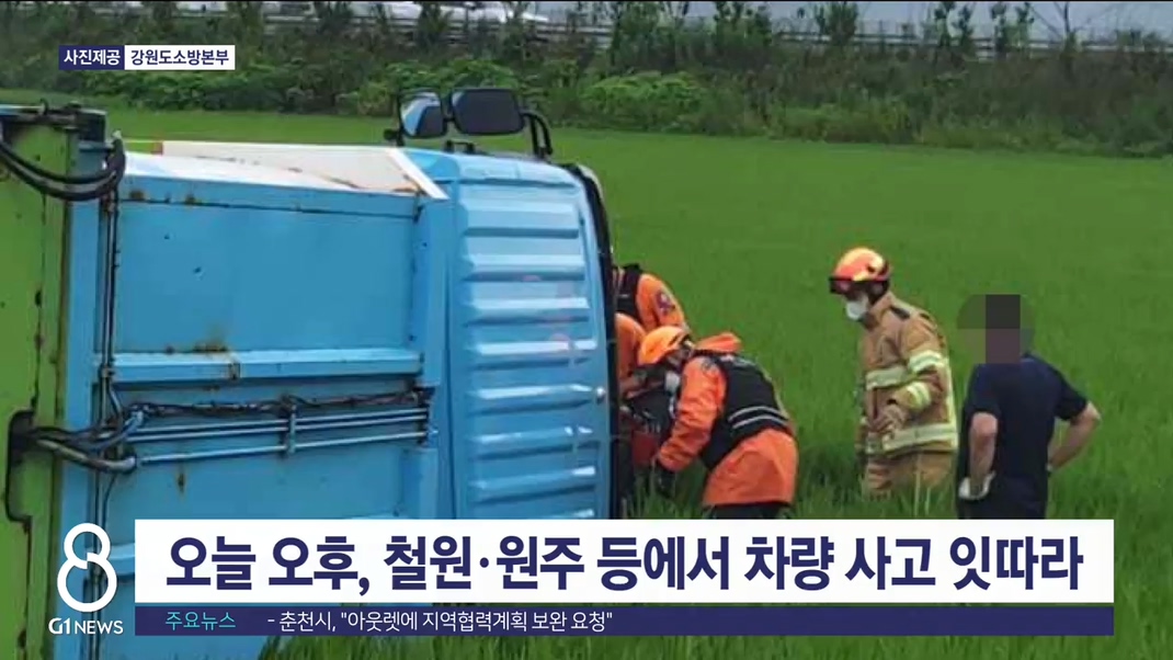 오늘 오후 1시 35분쯤 철원군 동송읍의 한 도로에서 5t 쓰레기 수거차량이 도로 옆 논으로 전도됐습니다.