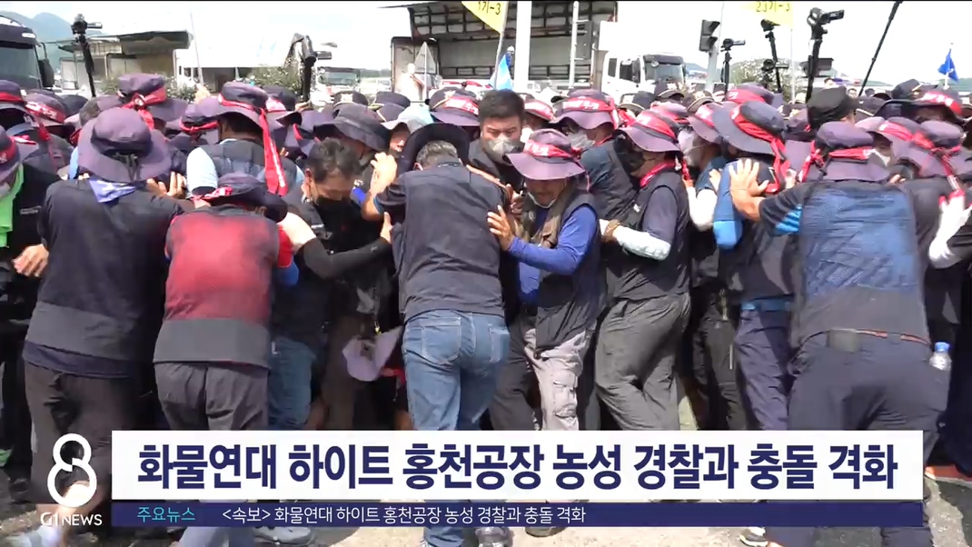 민주노총 화물연대의 하이트진로 홍천공장 앞 농성 사태가 경찰과의 충돌로 번지는 등 격화되는 양상입니다.
