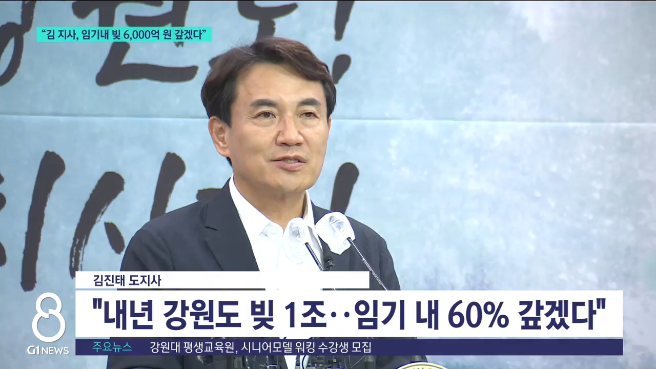 김진태 도지사가 1조 원에 육박하는 강원도 채무의 60%를 임기 내 갚겠다고 밝혔습니다.