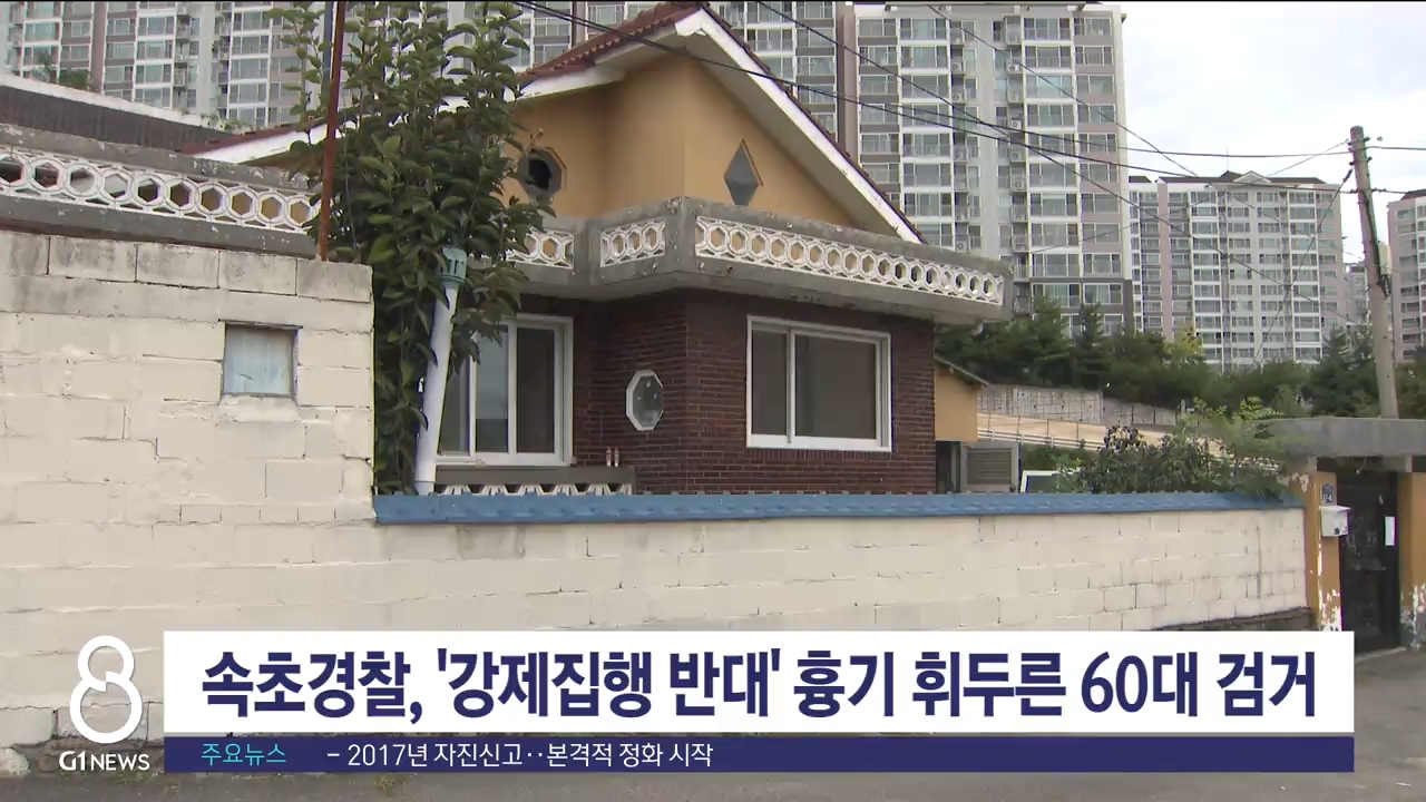 아파트 신축을 위해 매입한 주택을 강제집행하는 과정에서 이를 반대하며 흉기를 휘두른 60대 남성 A씨가 경찰에 붙잡혔습니다.