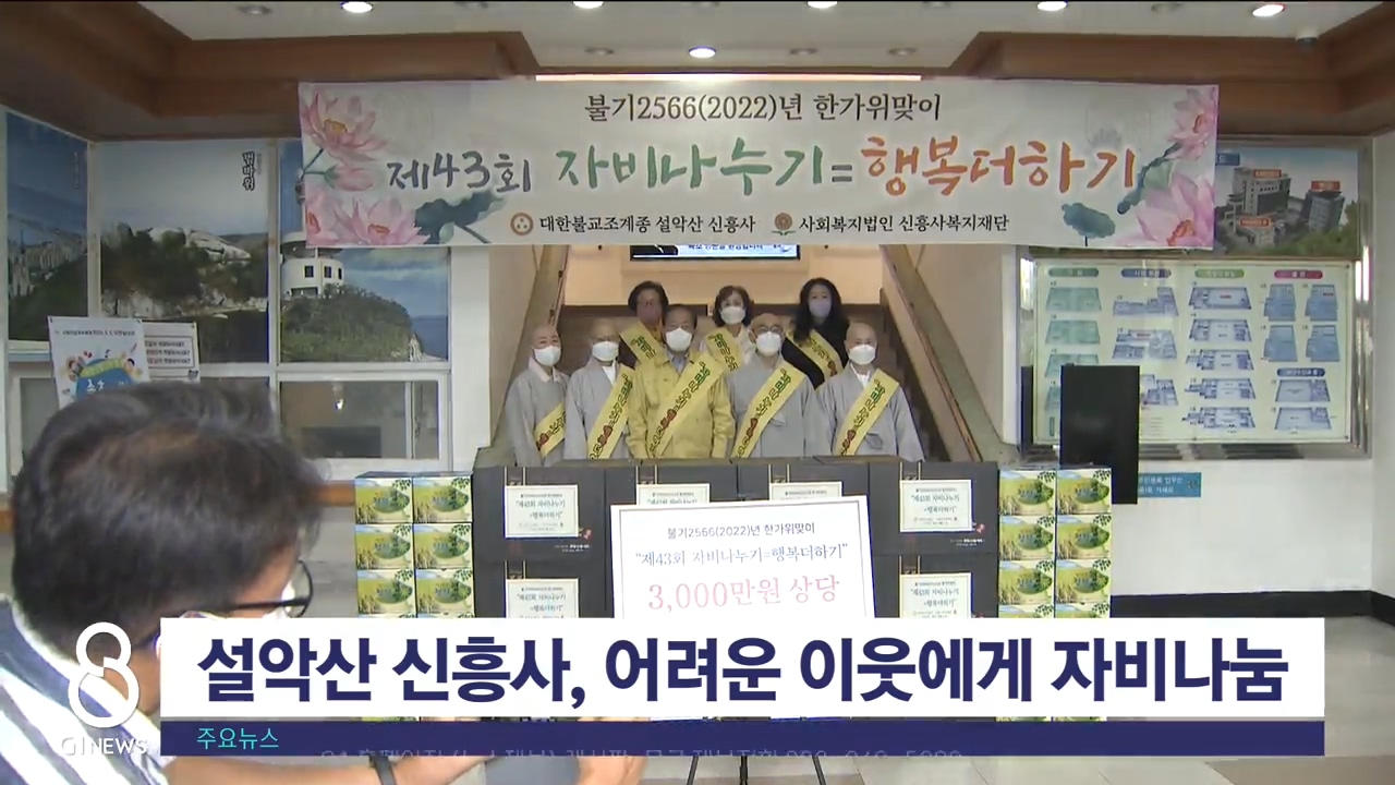 민족 대명절 추석을 앞두고 설악산 신흥사가 어려운 이웃을 위해 오늘(30일) 속초시청에서 '제42회 자비나누기, 행복더하기' 행사를 열었습니다.