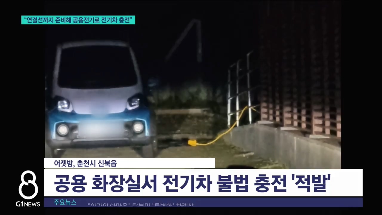 "도전 행위가 적발된 공용 화장실 입니다. 일반 콘센트에 비상용 충전기를 꽂아 몰래 전기차를 충전하는 얌체족들이 늘고 있습니다."