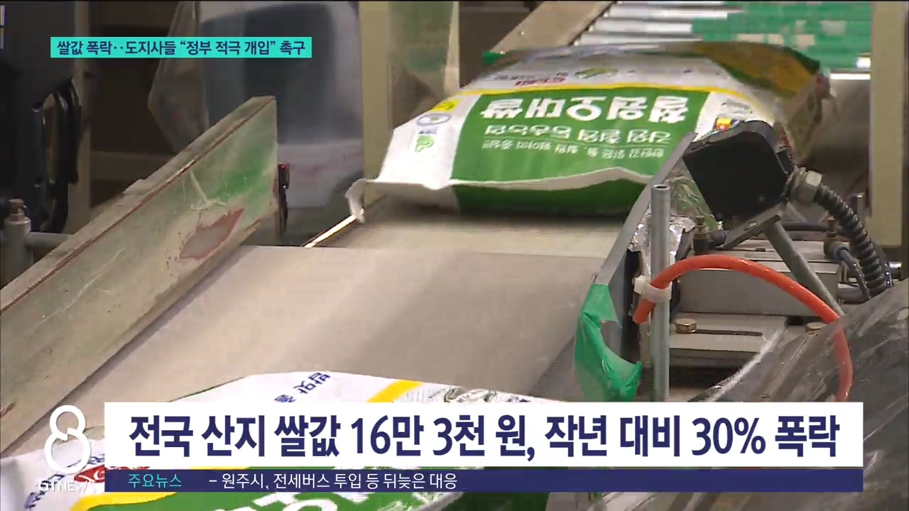 현재 전국 산지 쌀값이 80kg 기준 16만 3천원으로, 지난해 10월 22만원 선에 비해 30% 가까이 폭락했습니다.