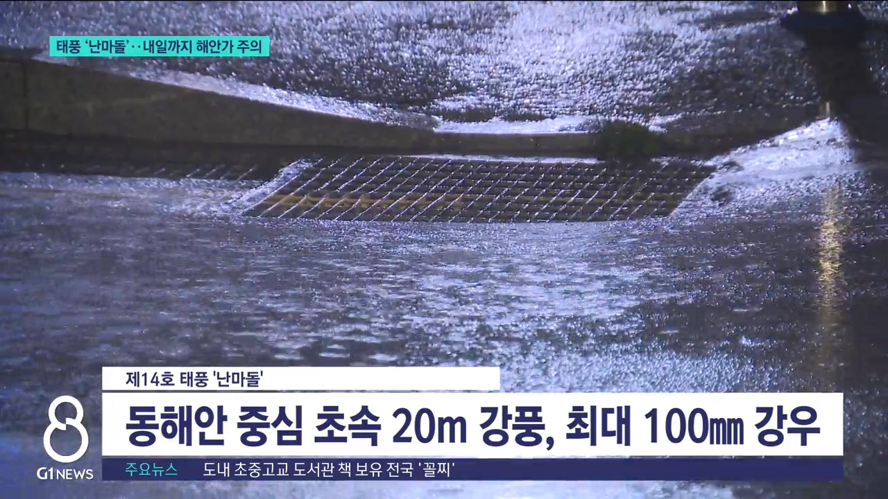 제14호 태풍 남마돌이 북상하면서 어젯 밤부터 오늘(19일) 오전까지 동해안을 중심으로 초속 20m 수준의 강풍과 최대 100mm가 넘는 비가 내렸습니다.