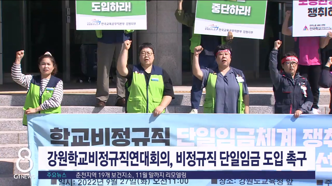 강원학교비정규직연대회의는 오늘(27일) 강원도교육청 앞에서 기자회견을 열고 비정규직의 단일 급여 체제 전환을 촉구했습니다.