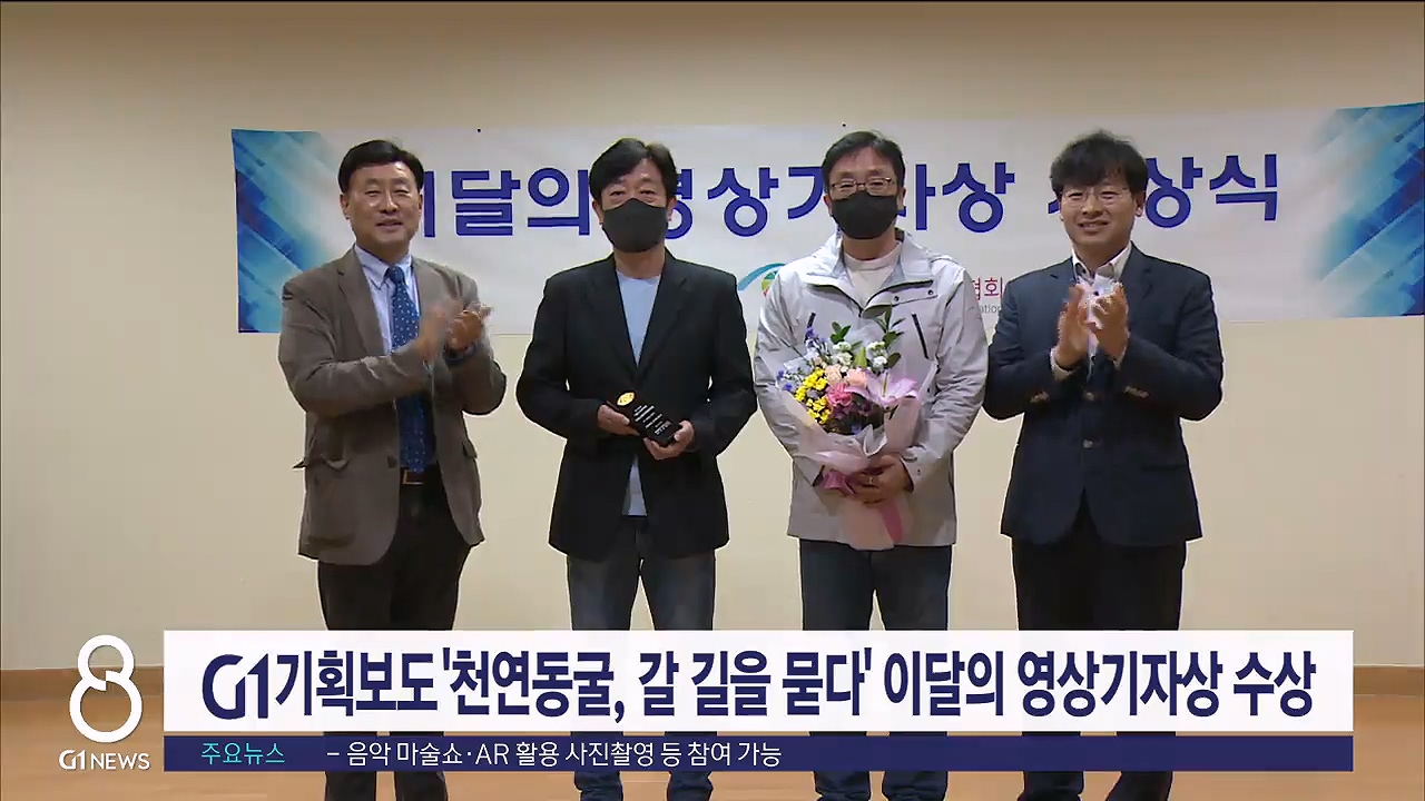 한국영상기자협회 나준영 회장은 오늘 G1 방송을 방문해, 제106회 이달의 영상기자상 지역뉴스 탐사기획보도 부문에 G1 방송 원종찬, 하정우 기자의 '천연동굴, 갈 길을 묻다' 보도를 선정해 시상했습니다.