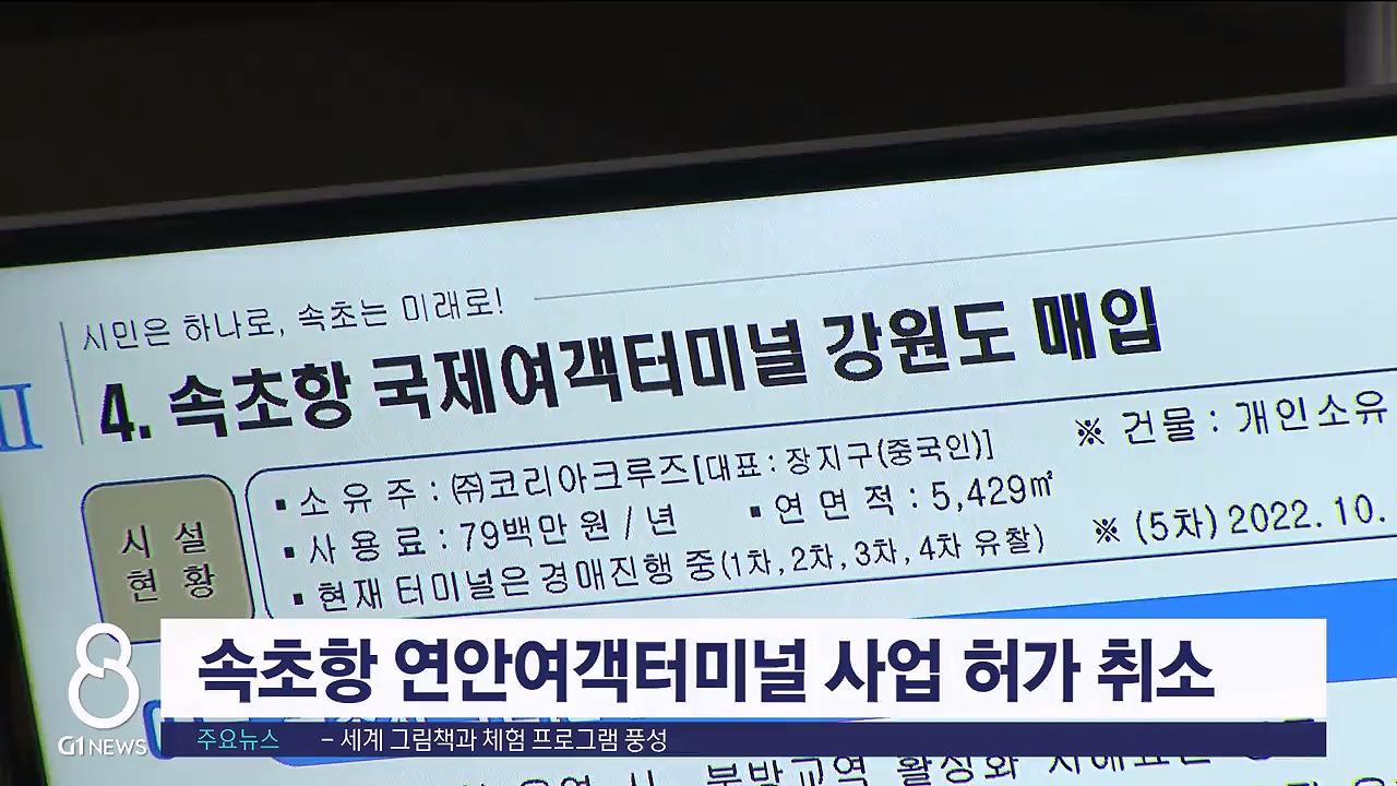 속초항 연안여객터미널 사업자가 허가를 받고 5년째 운항을 못하면서 애물단지로 방치되고 있다는 G1방송 보도와 관련해 강원도가 사업자의 허가를 취소했습니다.