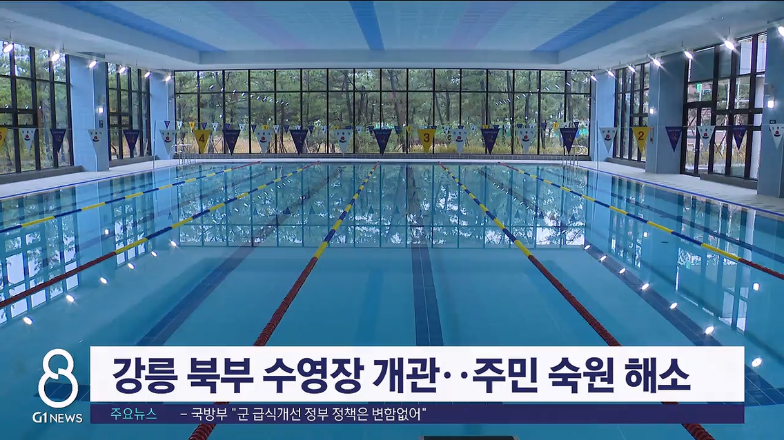 강릉 주문진읍 강릉도립대학교 안에 79억 원을 들여 조성된 강릉 북부 수영장은 연면적 천647㎡, 지하 1층 지상 1층 규모로, 25m 6레인 경영풀과 5m 잠수풀 등을 갖췄습니다.