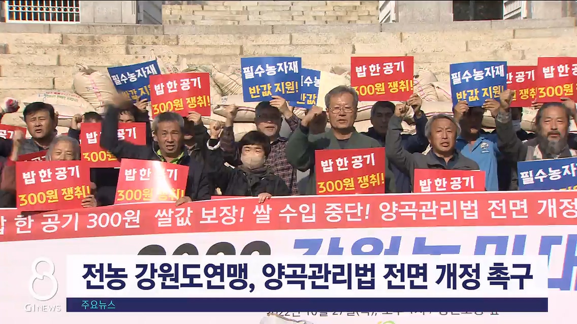 전농 강원도연맹은 "정부와 국회가 서로 남 탓만 하며 책임을 방기하고 있다"며 "밥 한 공기 쌀값 300원을 보장하라"고 주장했습니다.