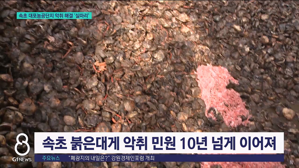 G1뉴스는 속초 대포농공단지 인근 주민들이 붉은 대게 부산물로 인한 악취때문에 십년 넘게 고통 받고 있다는 소식 얼마전 전해드렸는데요.